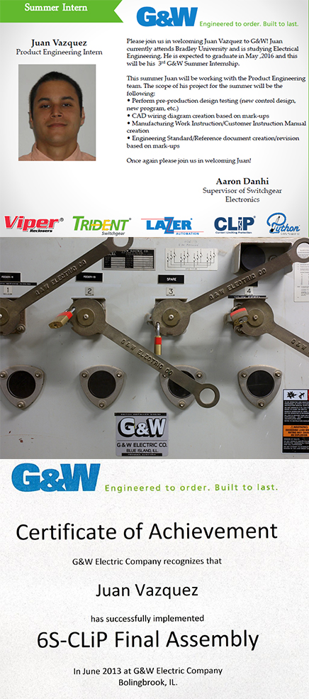 Prior to starting college, I was given the opportunity to intern at G&W Electric, a global supplier of electrical power equipment. I was placed in the Current Limiting Systems Protection (CLiP) division, where I shadowed the department technician and learned the assembly process of each CLiP unit. This internship introduced me to three-phase power systems and current limitation components including isolation transformers, fuses, and sensory firing logics.